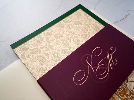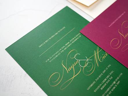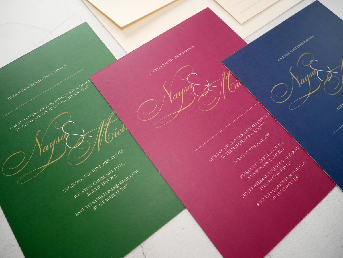 Each invitation includes a single 'wedding' insert, belly band and coloured envelope.