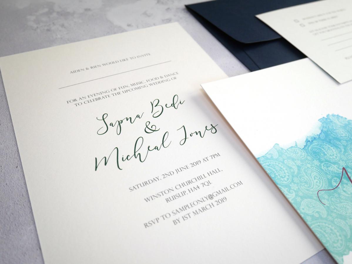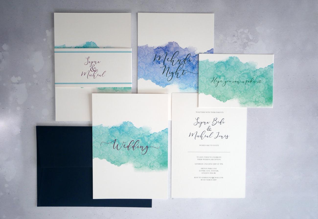 Each invitation includes a single 'wedding' insert, belly band and coloured envelope.