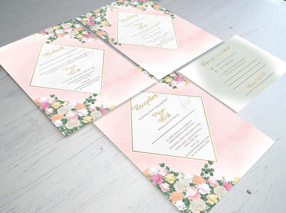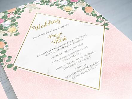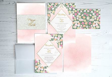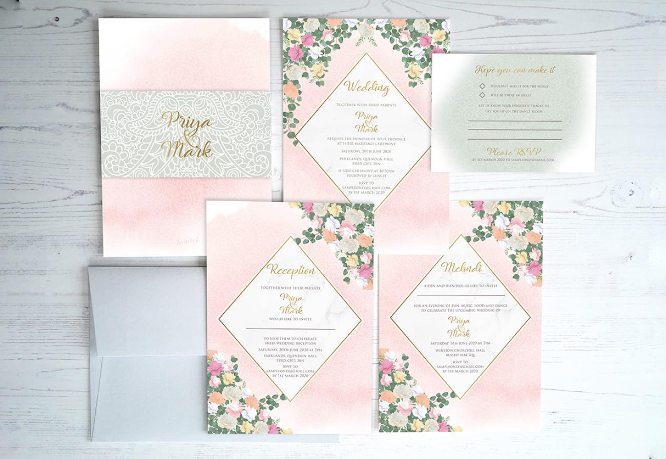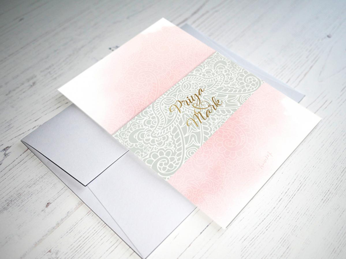 Each invitation includes a single 'wedding' insert, belly band and coloured envelope.